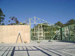 I had to go to Brisbane yesterday, but met the builders briefly before departing. When I arrived home in the dark, I shone the lights of my car on the Trainbarn site and the amazing sight of all the walls being up greeted me!! Really quick progress with the prefabricated frames. There were a couple of errors in dimensions, but these were quickly fixed today, so here are a few pictures of the progress. I must add that our builder has been really excellent and patient with all the small details that I'm so fussy about, and he's making sure that everything is just as I want it. Thanks Nick!!